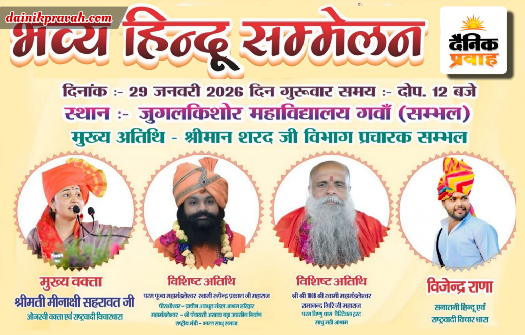 प्रवाह ब्यूरो संभल। संभल के गवां स्थित जुगल किशोर महाविद्यालय में आज हिंदू महा सम्मेलन का आयोजन किया जाएगा जिसमें मुख्य वक्ता मीनाक्षी सहरावत व मुख्य अतिथि विभाग के प्रचारक संभल शरद और विशिष्ट अतिथि के रूप में महामंडलेश्वर रूपेंद्र प्रकाश जी महाराज तथा स्वामी रामानंद गिरी जी महाराज उपस्थित रहेंगे साथ ही अपने विचार प्रस्तुत करेंगे और गायक विजेंद्र राणा भी अपनी प्रस्तुति देंगे। हिंदू सम्मेलन समिति द्वारा बताया गया कि हिंदुओं को एकजुट रहने तथा सामाजिक समरसता को लेकर विशेष रूप से स्वदेशी वस्तुओं का प्रयोग करने स्वदेशी भाषा और भोजन के बारे में भी चर्चा की जाएगी। साथ ही जातिवाद छोड़कर सभी को हिंदुत्व चेतना को आगे बढ़ाते हुए एकजुट रहने की अपील की जाएगी। गवां स्थित जुगल किशोर महाविद्यालय में राष्ट्रीय स्वयंसेवक संघ के विभाग प्रचारक संभल शरद मुख्य अतिथि के रूप में उपस्थित रहेंगे।