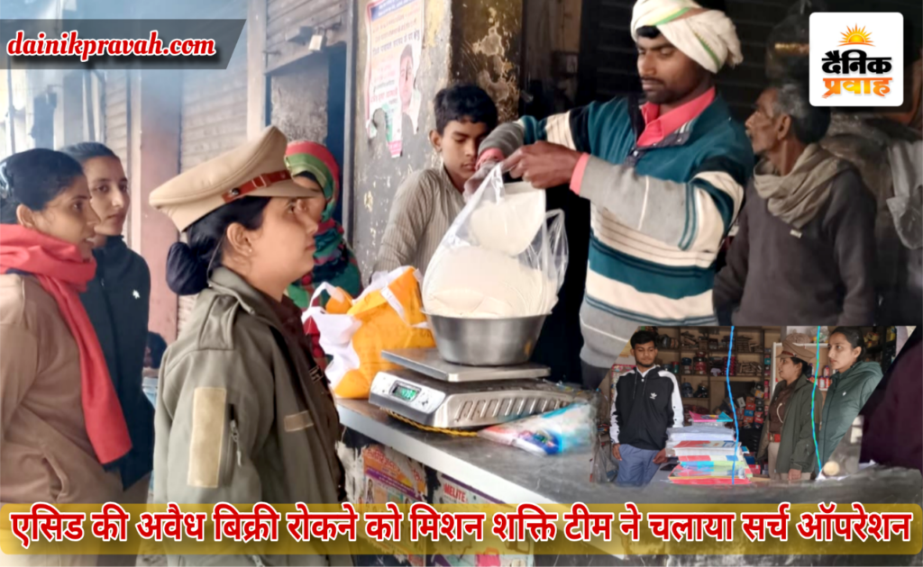 प्रवाह ब्यूरो संभल। संभल के कैला देवी थाना क्षेत्र के खास कैला देवी चौराहे पर मिशन शक्ति शक्ति टीम प्रभारी आंचल सिद्धू के नेतृत्व में ऑपरेशन शील्ड विशेष अभियान के तहत एसिड की अवैध बिक्री एवं वितरण को रोकने के लिए सर्च ऑपरेशन चलाया गया। इसके साथ ही दुकानदारों को एसिड की अवैध बिक्री नहीं करने को लेकर जागरूक किया गया। मिशन शक्ति टीम प्रभारी उप निरीक्षक आंचल सिद्धू के नेतृत्व में चलाए गए ऑपरेशन शील्ड विशेष अभियान के तहत कैलादेवी चौराहे पर स्थित कई दुकानों पर एसिड की अवैध बिक्री और वितरण को रोकने को लेकर सर्च ऑपरेशन किया गया। जहां दुकानदारों से भी पूछताछ की गई तथा दुकानों में जाकर एसिड की तलाशी ली गई। साथ ही सभी दुकानदारों को एसिड की अवैध बिक्री नहीं करने को लेकर जागरूक किया गया। एसिड की अवैध बिक्री करने पर संबंधित कार्यवाही के बारे में भी अवगत कराया। मिशन शक्ति टीम प्रभारी महिला उप निरीक्षक आंचल सिद्धू ने बताया कि ऑपरेशन शील्ड विशेष अभियान के तहत एसिड की अवैध बिक्री एवं वितरण को रोकने के लिए सर्च ऑपरेशन चलाया गया है तथा इसके संबंध में अवैध बिक्री नहीं करने को लेकर दुकानदारों को जागरूक किया गया है। इस दौरान महिला कांस्टेबल पूजा तथा ममता उपस्थित रहीं।