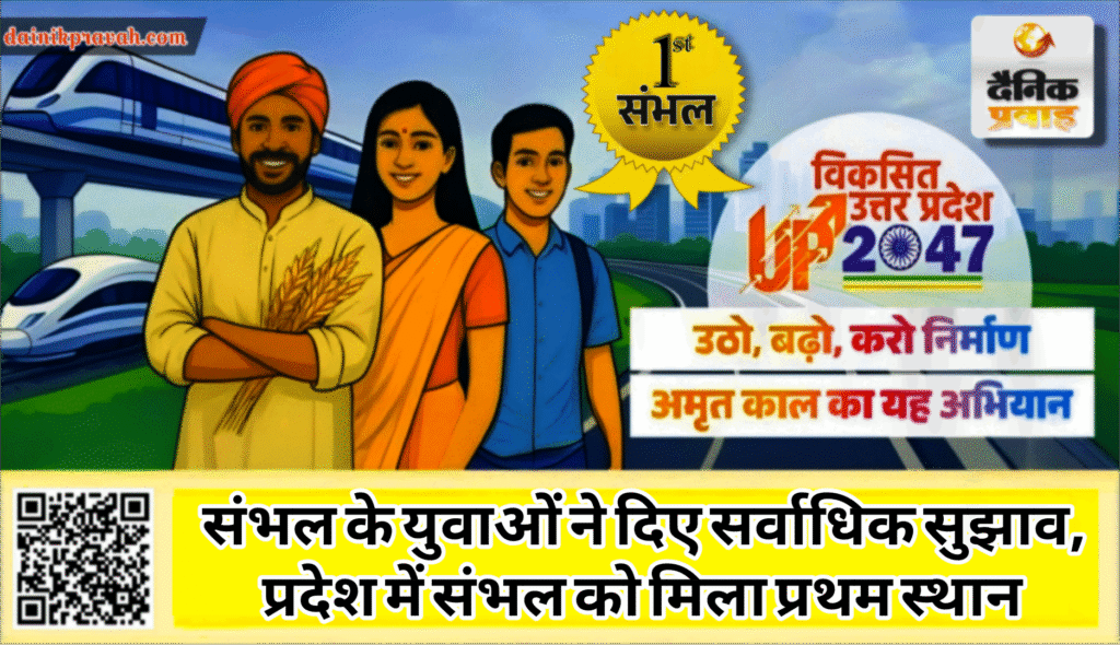 संभल। उत्तर प्रदेश सरकार द्वारा राज्य को 2047 तक विकसित उत्तर प्रदेश बनाने के उद्देश्य से चलाए गए विकसित उत्तर प्रदेश समर्थ उत्तर प्रदेश पोर्टल पर समस्त प्रदेशवासियों द्वारा मांगे गए सुझावों को देने में संभल जनपद प्रथम स्थान पर आया है। संभल वासियों ने सुझाव देने में पूरे प्रदेश में सक्रिय भूमिका निभाते हुए अपनी जगह प्रथम स्थान पर बना ली है। संभल को प्रथम स्थान पर लाने में युवाओं की सक्रिय भागीदारी रही है तथा अभी भी सुझाव लगातार युवाओं से लेकर 60 वर्ष से ऊपर तक के नागरिकों द्वारा भी दिए जा रहे हैं।