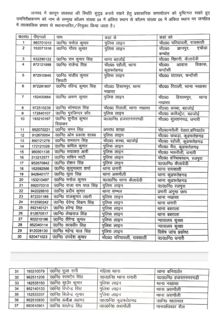 वरिष्ठ उपनिरीक्षक धनारी सत्यदेव सिंह को थाना हजरतनगरगढ़ी और कुढ़फतेहगढ़ के वरिष्ठ उपनिरीक्षक अनीश अहमद को उपनिरीक्षक यातायात बनाया गया है। इसके अलावा वरिष्ठ उपनिरीक्षक असमोली कालेन्द्र सिंह को मानव अधिकार सेल में स्थानांतरित किया गया है।