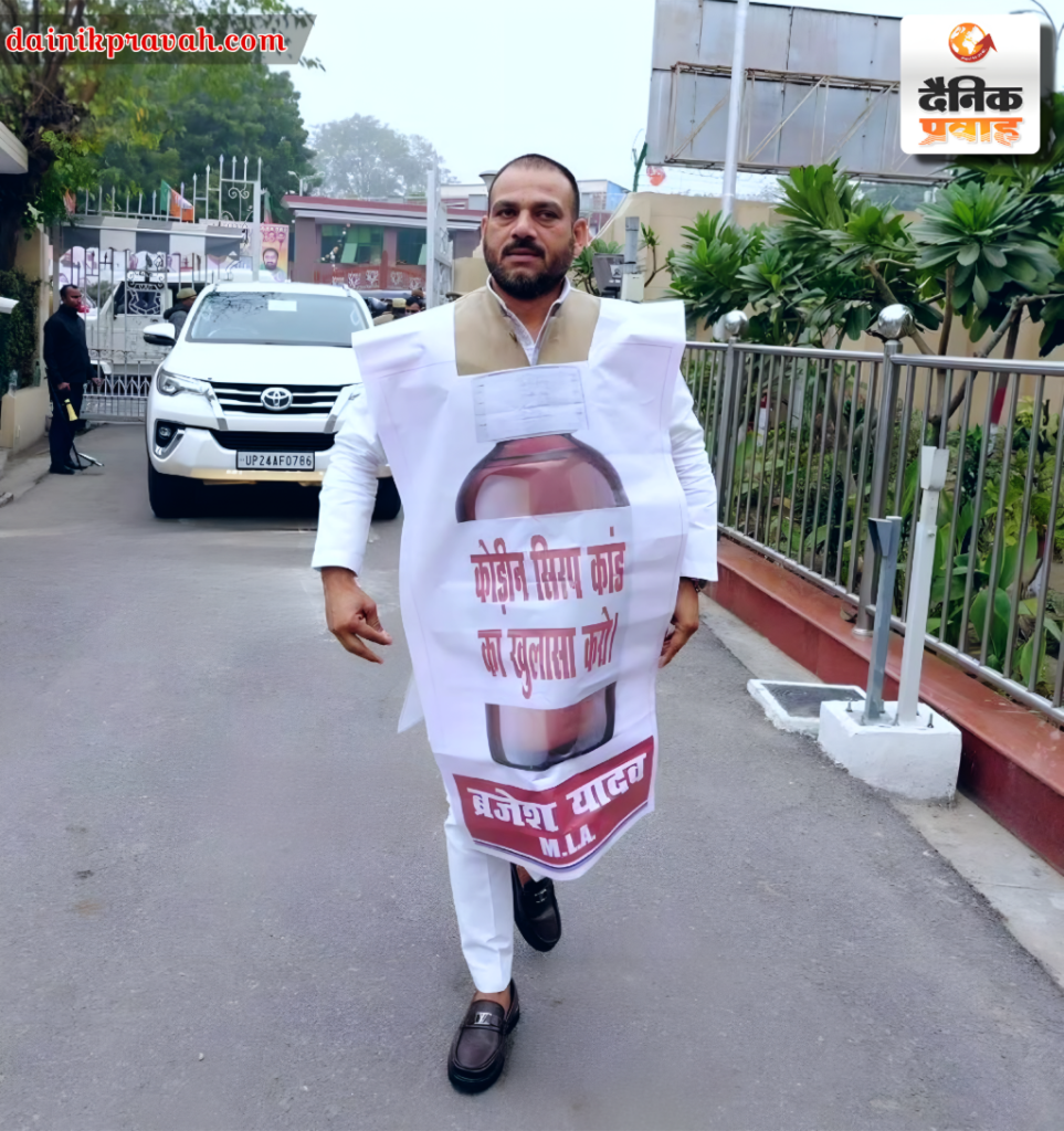 प्रवाह ब्यूरो लखनऊ। यूपी के विधानसभा के शीतकालीन सत्र के दौरान सपा विधायक ब्रजेश यादव ने अनोखे अंदाज में विरोध प्रदर्शन किया। वे साइकिल पर सवार होकर विधानसभा पहुंचे और साथ में एक कटआउट भी चस्पा किया जो जहरीली कफ सिरप से बच्चों की मौत के खिलाफ उनका विरोध दर्शाता है। उनकी साइकिल पर लगे कटआउट में लिखा कि, ‘जादुई कफ सिरप, पीने वाला मर जाता है. बेचने वाला दौलतमंद हो जाता है। सत्ता का संरक्षण पाता है। फिर विदेश निकल जाता है। यह प्रदर्शन ग्रामीण और गरीब परिवारों की स्वास्थ्य सुरक्षा पर बड़ा सवाल उठाता है। विधायक ब्रजेश यादव ने कहा, ‘हमारे राज्य और पूरे देश में चर्चा हो रही है कि भाजपा ने जहरीले कफ सिरप बांटे, जिससे गरीबों के बच्चे मारे गए। लोगों ने पैसे कमाए और विदेश भाग गए। किन्तु भाजपा सरकार उन्हें बचाने में लगी है। बल्कि सरकार को ऐसे लोगों को तुरंत गिरफ्तार करके जेल भेजना चाहिए।