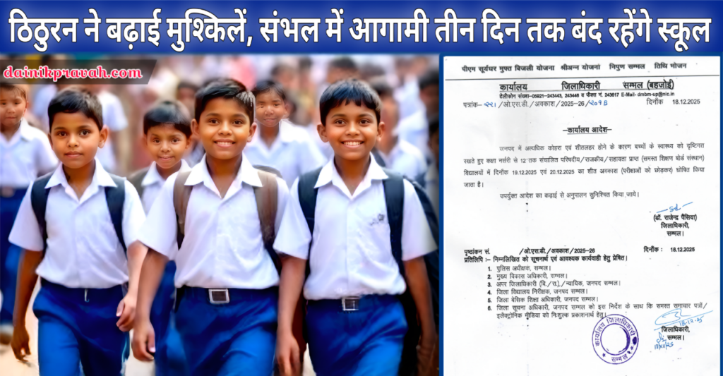 प्रवाह ब्यूरो संभल। जनपद में लगातार बढ़ रही कड़ाके की ठंड और शीतलहर के चलते आम जनजीवन प्रभावित हो गया है। ठिठुरन भरी सर्दी को देखते हुए जिला प्रशासन ने एहतियातन बड़ा निर्णय लिया है। जहां विपरीत मौसम और बढ़ती ठंड के बीच संभल जिलाधिकारी डॉ. राजेंद्र पैंसिया ने जिले के सभी विद्यालयों में दो दिन का अवकाश घोषित किया है। छात्रों के स्वास्थ्य और सुरक्षा को ध्यान में रखते हुए संभल जनपद में डीएम ने 19 और 20 दिसंबर को नर्सरी से कक्षा 12वीं तक संचालित सभी परिषदीय, सहायता प्राप्त और निजी विद्यालयों को बंद रखने के निर्देश दिए हैं। ठंड के कारण खासतौर पर छोटे बच्चों को हो रही परेशानियों को देखते हुए यह फैसला लिया गया है। प्रशासन ने विद्यालय प्रबंधन और अभिभावकों से अपील की है कि वे आदेशों का सख्ती से पालन करें।