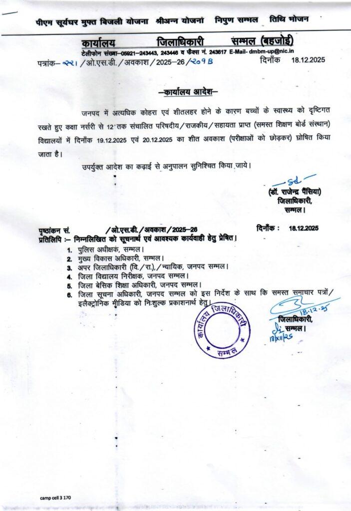 वहीं, मौसम विभाग के अनुसार अभी ठंड से राहत मिलने के आसार कम हैं और तापमान में और गिरावट हो सकती है। ठंड के चलते लोग अलाव और गर्म कपड़ों का सहारा ले रहे हैं। प्रशासन द्वारा सार्वजनिक स्थानों पर अलाव की व्यवस्था भी की जा रही है। जनपद में पिछली चार दिन तक घना कोहरा छाया छाया रहा जो बृहस्पतिवार को कुछ छटा किन्तु ठंडी हवा ने और ठिठुरन बढ़ा दी। बुधवार के मुकाबले बृहस्पतिवार को एक डिग्री तापमान ज्यादा दर्ज किया गया। न्यूनतम तापमान 10 और अधिकतम तापमान 22 डिग्री दर्ज हुआ। यही बजे रही कि सर्दी को देखते हुए जिलाधिकारी डॉ. राजेंद्र पैंसिया ने जनपद के सभी बोर्ड के कक्षा 12 तक के स्कूल 19 एवं 20 दिसंबर को बंद रखने के आदेश दिए हैं जबकि 21 दिसंबर को रविवार होने के चलते समस्त स्कूल स्वत: बंद रहेंगे। कपकपाते हुए स्कूल जाते उन सभी बच्चों के लिए आगामी तीन दिन की ये छुट्टी एक राहत की खबर लेकर आई हैं। दिसंबर के दूसरे सप्ताह से लगातार सर्दी बढ़ रही है। चार दिन तक घने कोहरे ने रात और सुबह का सफर मुश्किल से भरा कर दिया। दृश्यता शून्य हो गई और रात के समय वाहनों की आवाजाही पर ब्रेक लग गया। जो वाहन जरूरी सामान लेकर आगे बढ़े वह रेंगते हुए दिखाई दिए। बृहस्पतिवार को घने कोहरे से तो राहत मिली लेकिन सर्दी का सितम जारी रहा। जो लोग घरों से बाहर निकले वह ठिठुरते हुए दिखाई दिए। अलाव पर सर्दी से राहत पाई या वह ऐसी जगह खड़े हुए जहां सीधी हवा न लगे। पिछले कुछ दिनों से जिलाधिकारी को बड़ी संख्या में स्कूली बच्चों के संदेश आ रहे थे। बच्चे ने मासूम अंदाज में ‘डीएम अंकल, छुट्टी कर दीजिए’ कहते हुए सोशल मीडिया के माध्यम से अवकाश की मांग कर रहे थे। जहां ठंड और मौसम की स्थिति को देखते हुए डीएम संभल द्वारा अब यह निर्णय लिया गया है।