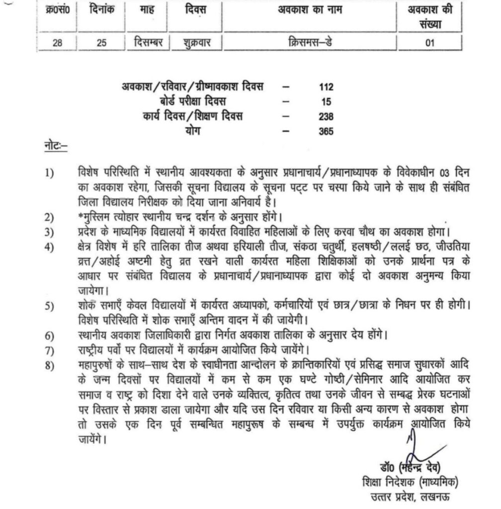 विशेष परिस्थितियों में स्थानीय आवश्यकता के अनुसार प्रधानाचार्य विवेकाधीन की तीन छुट्टी कर सकेंगे। विवाहित शिक्षिकाओं को करवा चौथ की छुट्टी मिलेगी। क्षेत्र विशेष में हरि तालिका तीज या हरियाली तीज, संकठा चतुर्थी, हलषष्ठी, अहोई अष्टमी का व्रत रखने वाली शिक्षिकाओं को प्रार्थना पत्र के आधार पर प्रधानाध्यापक या प्रधानाचार्य स्तर से कोई दो छुट्टी दी जाएगी। डीएम के निर्देश पर स्थानीय अवकाश दिए जाएंगे। जबकि जारी कैलेंडर के अनुसार वर्ष 2026 में माध्यमिक विद्यालयों में कुल 112 दिन अवकाश रहेगा व 238 दिन शैक्षणिक कार्य संचालित किया जाएगा।