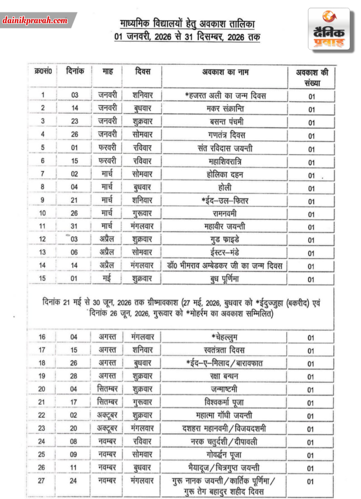 प्रवाह ब्यूरो लखनऊ। माध्यमिक शिक्षा निदेशक डा. महेंद्र देव ने वर्ष 2026 के लिए नया अवकाश कैलेंडर मंगलवार को जारी कर दिया। इसके मुताबिक प्रदेश के राजकीय माध्यमिक स्कूलों में नए कैलेंडर वर्ष में 365 में 238 दिन पढ़ाई होगी और 112 दिन त्योहारों, रविवार व अन्य अवकाश रहेगा। जबकि बोर्ड की परीक्षा 15 दिन होगी। अवकाश कैलेंडर में ग्रीष्मावकाश, त्योहारों एवं अन्य सार्वजनिक अवकाशों को शामिल किया गया है। निदेशक ने स्पष्ट किया है कि विद्यालयों में निर्धारित शैक्षणिक दिवसों का कड़ाई से पालन किया जाएगा, ताकि विद्यार्थियों की पढ़ाई प्रभावित न हो। कैलेंडर जारी होने के साथ ही सभी जिला विद्यालय निरीक्षकों और विद्यालय प्रबंधन को निर्देश दिए गए हैं कि वे शैक्षणिक गतिविधियों का संचालन नए कैलेंडर के अनुसार सुनिश्चित करें। नए अवकाश कैलेंडर से विद्यार्थियों, अभिभावकों और शिक्षकों को वर्ष भर की शैक्षणिक योजना बनाने में सुविधा मिलेगी।