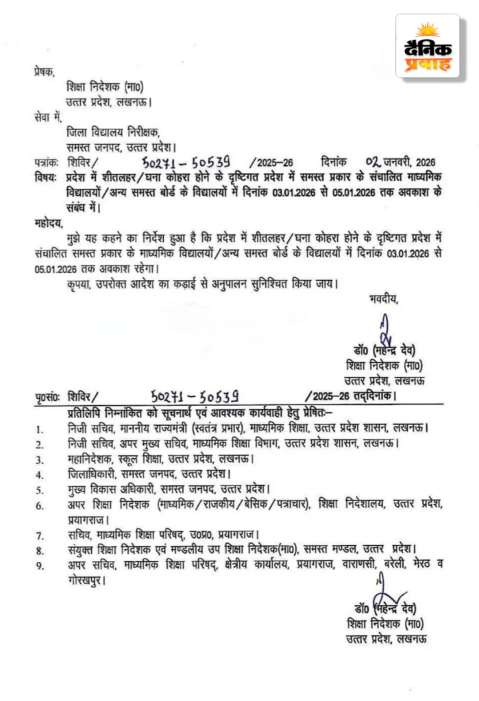 प्रवाह ब्यूरो लखनऊ। प्रदेश में लगातार बढ़ रही शीतलहर और भीषण ठंड को देखते हुए मुख्यमंत्री योगी आदित्यनाथ ने बड़ा फैसला लिया है। जिसके तहत समस्त प्रकार के माध्यमिक विद्यालयों को 5 जनवरी तक बंद रखने का आदेश जारी किया गया है। तेजी से गिरते तापमान और बच्चों के स्वास्थ्य को ध्यान में रखते हुए यह निर्णय लिया गया है। शिक्षा विभाग को निर्देश दिए गए हैं कि आदेश का सख्ती से पालन कराया जाए। ठंड से बचाव को लेकर लोगों से सतर्क रहने और आवश्यक सावधानियां बरतने की अपील की गई है।