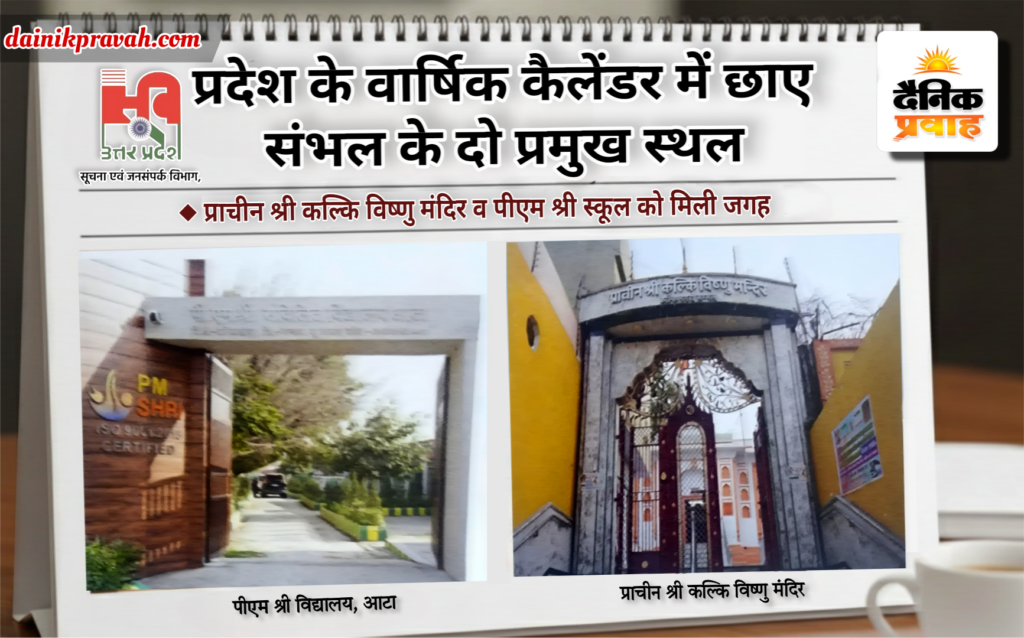 प्रवाह ब्यूरो संभल। सूचना विभाग उत्तर प्रदेश द्वारा जारी किए गए 2026 के वार्षिक कैलेंडर में संभल जनपद को विशेष पहचान मिली है। प्रदेश स्तर पर प्रकाशित इस प्रतिष्ठित कैलेंडर में संभल के दो प्रमुख स्थलों को स्थान दिया गया है, जिनमें प्राचीन श्री कल्कि विष्णु मंदिर और जनपद के आटा स्थित पीएम श्री विद्यालय शामिल हैं। इस कैलेंडर में प्रकाशित कुल 24 स्थान में से संभल के दो स्थलों को जगह मिलना जनपद के लिए गौरव का विषय माना जा रहा है। उत्तर प्रदेश शासन द्वारा 2026 का वार्षिक कैलेंडर जारी किया गया है। जिसे शासन के सूचना एवं जनसंपर्क विभाग द्वारा जारी किया गया है, जिसमें संभल जनपद के दो स्थानों में एक शिक्षा के मंदिर तो एक धार्मिक आस्था वाले मंदिर को जगह मिली है। सूचना विभाग द्वारा जारी किए गए वार्षिक कैलेंडर में दोनों स्थानों की कार्यकारिणी को दर्शाया गया है तथा जिन्हें अपनी विशेष पहचान के साथ उजागर किया गया है। संभल के जिलाधिकारी डॉ. राजेंद्र पैंसिया के नेतृत्व में बीते दिनों जनपद में 16 पीएम श्री विद्यालयों का निर्माण कराया। जिनका उद्देश्य आधुनिक डिजिटल युग की आवश्यकताओं को ध्यान में रखते हुए बच्चों को मूलभूत सुविधाएं उपलब्ध कराना, आधुनिक व्यवस्थाओं के अनुरूप शिक्षा प्रणाली को सशक्त बनाना तथा विद्यालयों के समग्र कायाकल्प को मजबूत और सुदृढ़ करना था। जिससे शिक्षा के क्षेत्र में आधुनिक सुविधाओं का विस्तार हुआ और विद्यालयों की तस्वीर पूरी तरह बदल गई।