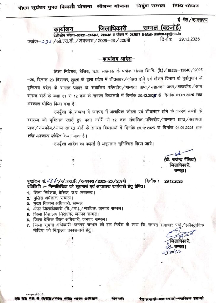मुख्यमंत्री योगी आदित्यनाथ ने कहा है कि बच्चों की सुरक्षा सर्वोपरि है, इसमें किसी भी प्रकार की लापरवाही बर्दाश्त नहीं की जाएगी। संभल जनपद में भी जिलाधिकारी डॉ. राजेंद्र पैंसिया ने मुख्यमंत्री के आदेश का पालन कराने के लिए जनपद के 12वीं तक के सभी स्कूलों को 1 जनवरी तक बंद रखने व कढाई से अनुपालन सुनिश्चित करने के निर्देश दिए हैं।