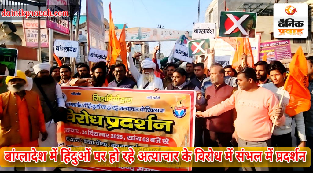 प्रवाह ब्यूरो संभल। बांग्लादेश में हिंदुओं पर हो रहे अत्याचार के विरोध में संभल में विश्व हिंदू परिषद और बजरंग दल द्वारा प्रदर्शन करते हुए पुतला फूंका गया। बांग्लादेश में हिंदुओं के साथ किए जा रहे अत्याचार के विरोध में संभल में विश्व हिंदू परिषद तथा बजरंग दल द्वारा प्रदर्शन किया जा रहा है जहां हिंदुओं के साथ अन्याय के खिलाफ आवाज उठाते हुए उन्हें न्याय दिलाने की मांग की जा रही है साथ ही संबंधित अधिकारियों को ज्ञापन भी दिया जाता है। बुधवार को भी संभल के बबराला में इंदिरा चौक पर विश्व हिंदू परिषद के जिला अध्यक्ष अमित गुप्ता और जिला मंत्री वेद प्रकाश तथा संयोजक विजेंद्र सिंह और बजरंग दल द्वारा उनके नेतृत्व में दर्जनों कार्यकर्ताओं के साथ बांग्लादेश में हिंदुओं पर हो रहे अत्याचार के खिलाफ विरोध प्रदर्शन किया गया, साथ ही अत्याचार करने वाले मोहम्मद यूनुस का पुतला फूंका गया।
